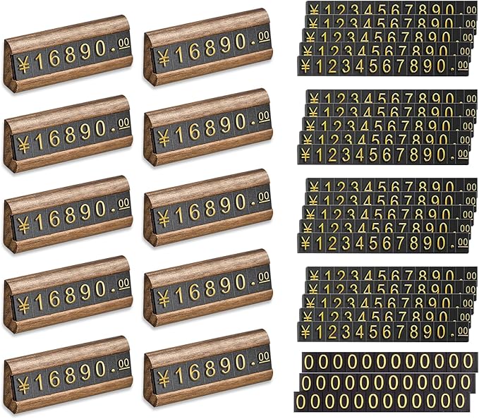 ELECTRO-WEIDEWORLD プライスカード 木製 おしゃれ 値札プレート セット プライスカード設置台10個 0-9プライスカード20本+0プライスカード3本(総計36個)付き プライスキューブ プライスタグ 価格表示 店舗 プライスキューブ ディスプレイ 万の値まで表示可能 (黒胡桃材/金文字,台座10個セット)