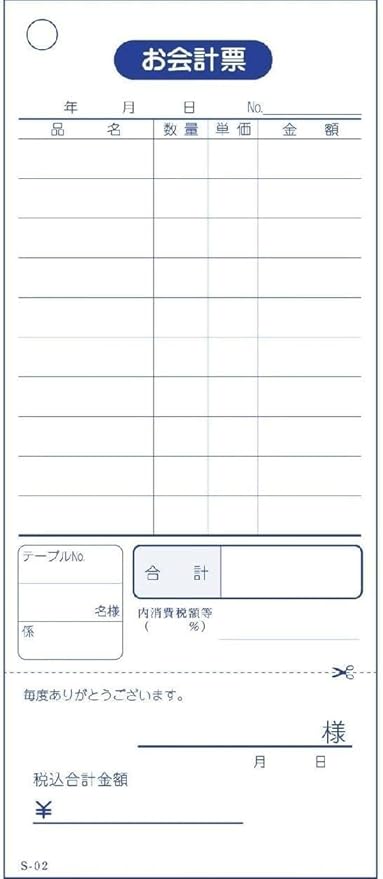 会計伝票 お会計票 S-02 単式10行・ミシン入 100枚