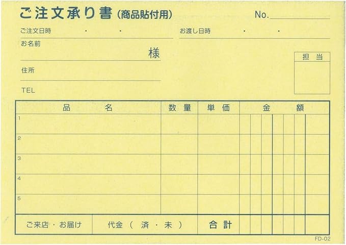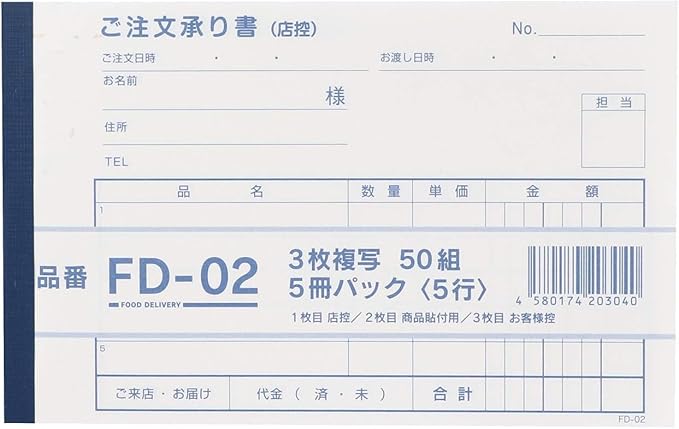 ご注文承り書(宅配伝票)FD-02 3P 5行 50組/冊 5冊入り
