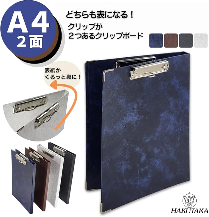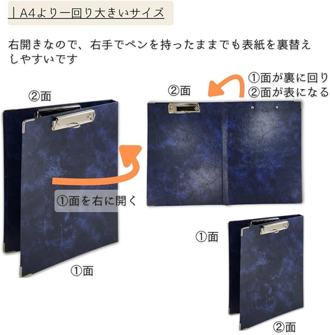 どっちも表。クリップが二つ付いたA4サイズの二つ折りクリップボードで両面の書類をしっかり保持。 表紙を裏返す事でどちらの面も表として使えます。