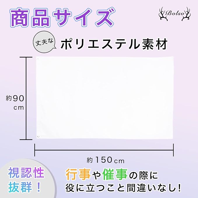 こちらの大旗のサイズは、約90 150cmとなっています。大きめのサイズだから遠くからの視認性もばっちり!どこに置いても目立つため、行事や催事の際に役に立つこと間違いなし!