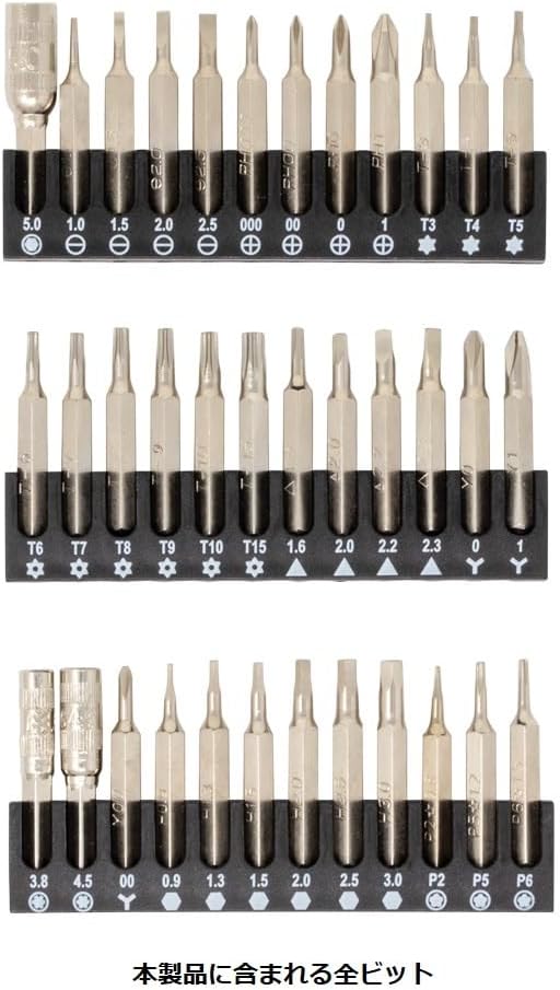 ■材質 ■ビット: ニッケルクロムモリブデン鋼 (SAE8660) ■ドライバーハンドル: アルミニウム ■ピック型オープナー、プラスチックへら: ABS ■吸盤: PVC ■ピンセット、メタルスパッジャー: ステンレス鋼