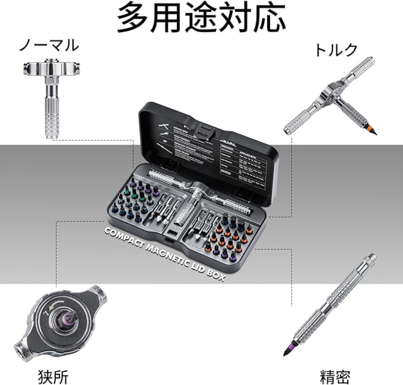 特徴 マグネット式, ラチェットドライバー, 交換可能なビット, 組み合わせハンドル
