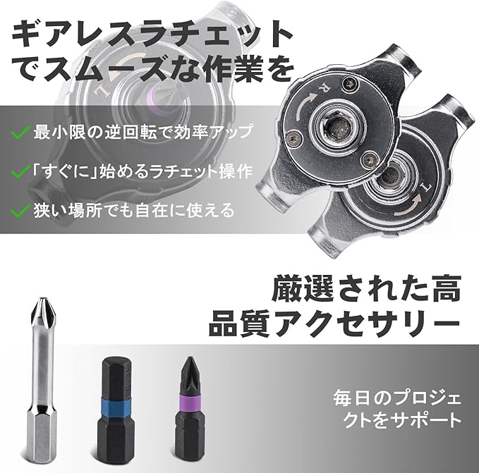 疲れにくい作業:ラチェット機能付きのハンドルは、ネジの締め付けや緩め作業を効率的に行うことができ、作業時間を短縮します。また、手首への負担を軽減する設計となっており、長時間の作業でも疲れにくいのが特徴です。