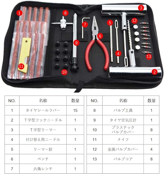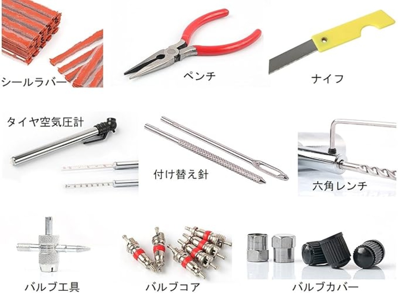 タイヤシールラバー 15、T字型フックニードル 1、T字型リーマー 1、付け替え用ニードル 1、リーマー針 1、六角レンチ 1、ペンチ 1、バルブ工具 1、バルブコア 8、金属バルブカバー 4、プラスチックバルブカバー 8、タイヤ空気圧計 1、ナイフ 1、専用収納ケース 1。