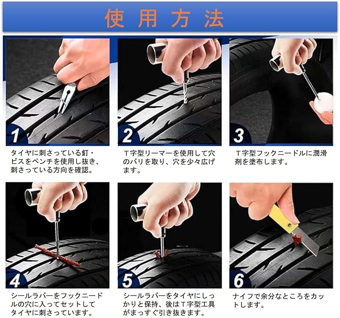 ユニバーサル緊急パンクタイヤ修理ツールセット。パッケージサイズ: 約20.5 14.5 4.5㎝ 、パッケージ重量:約600g。