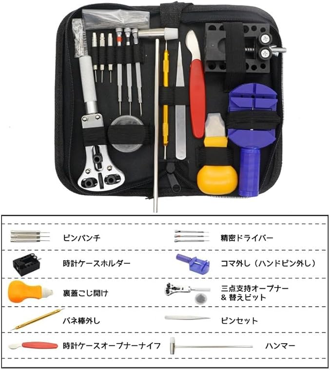【腕時計工具 セット内容】:時計工具 金属ハンマー、バンドピン抜き棒x3(0.8mm/0.9mm/1.0mm)、腕時計修理の精密ドライバー(1.2、1.4、1.6mm)x3、バネ外棒、バネ外器、バネ外器交換用ビットx7、腕時計交換用ウォッチピン(バネ棒)(2.8cm~1.0cm)x108、腕時計ホルダー、裏蓋開け器、腕時計三点支持オープナー、腕時計三点支持オープナー替えビットx18、オープナーナイフ、ステンレス製ピンセット、収納ケース付き。