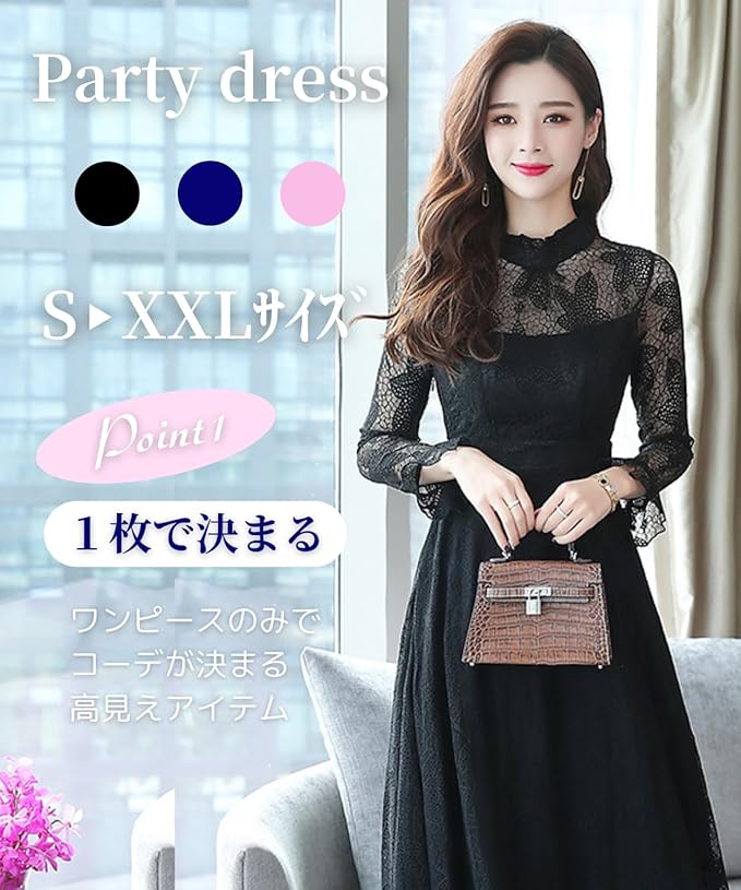 上品なデザインの総レースの大人っぽいワンピースです。お呼ばれはもちろんパーティーや結婚式などフォーマルな場面で大活躍の1枚持っていると安心なワンピースです。女子会、二次会、謝恩会、同窓会、食事会、歓迎会、通勤、通学など幅広いシーンにご着用頂けます。長袖タイプで秋から冬にかけて、そして春にかけて着用出来るデザインになっております。