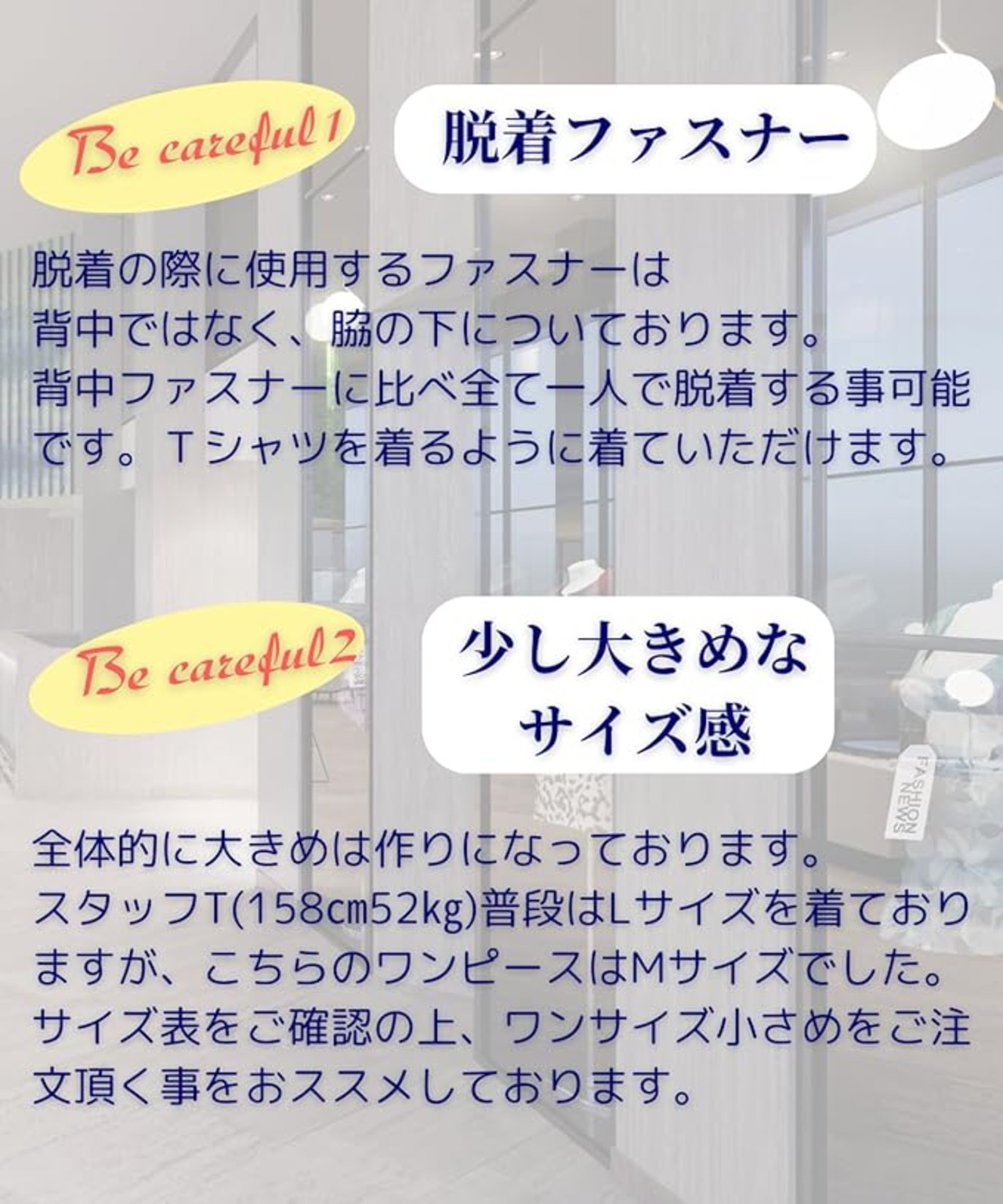 【カラー】ブラック・ネイビー・ピンク【サイズ】Sサイズ・Mサイズ・Lサイズ・XLサイズ・XXLサイズ ※少し大きめな作りになっております。スタッフ30代女性158㎝52㎏でMサイズでジャストサイスでした。また背中ファスナーでは無く右の脇の下にファスナーがございます。脱着の際はお気をつけ下さい。