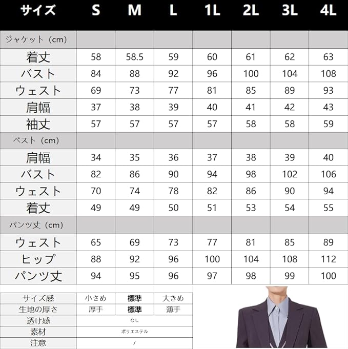 セット内容:ジャケット ベスト パンツの3点セット、定番のノッチドラペル襟のデザインで、きちんと感と知的さを演出してくれます。さらに、生地は堅牢で変形しにくく、静電気や毛玉も発生しにくく、手入れも簡単です。