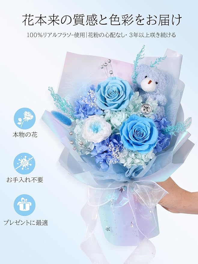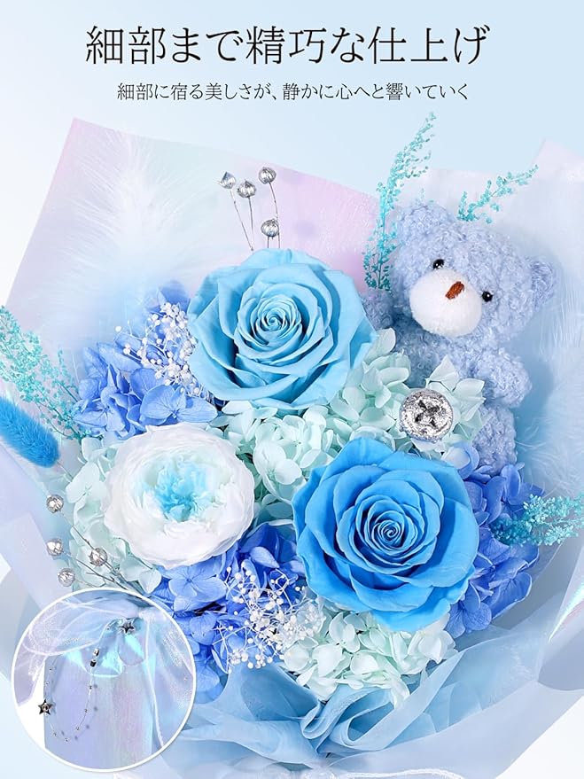 プリザーブドフラワー 青い花束 バラ 熊ぬいぐるみ付き 枯れない花 誕生日 記念日 お祝い 女性 彼氏 子供 プレゼント ブーケ 卒業式 発表会 ギフト