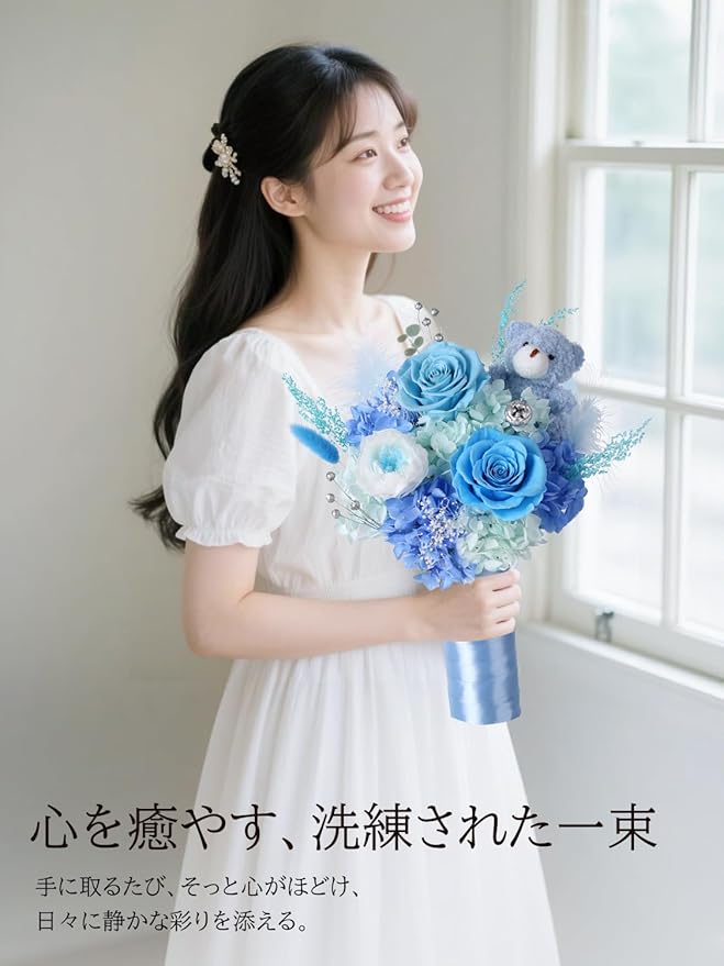 【手入れ不要、3年以上咲き続ける】高品質な生花を厳選し、日本から発展したプリザーブドフラワー技術を用い、職人より丁寧に加工されて仕上げたプリザーブドフラワーの花束。水やりやお手入れが不要で、生花のように儚く枯れることもなく、3年以上その美しさを保ちます。そのまま飾るだけで気軽に花の美しさを楽しむことができます。