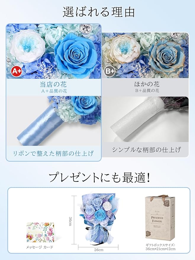 【プレゼントにおすすめ】卒業式、誕生日、記念日、母の日、父の日、結婚記念日、バレンタイン、ホワイトデー、クリスマス、発表会など、特別な日に贈るプレゼントとして最適です。花束は手提げ付きのギフトボックスに入れて、どこでも簡単に持ち運べ、贈る瞬間の感動をそのままに届けることができます。
