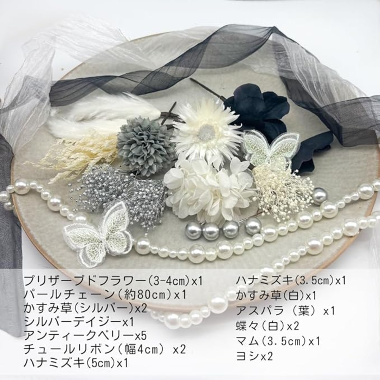 【セット内容】アジサイ、パールチェーン、マム、蝶々、かすみ草、シルバーデイジー、カスピア、ラグラス、チュールリボン、ベリーピック、マム、ゴールド花。セット内容は6枚目の画像をご参照ください。