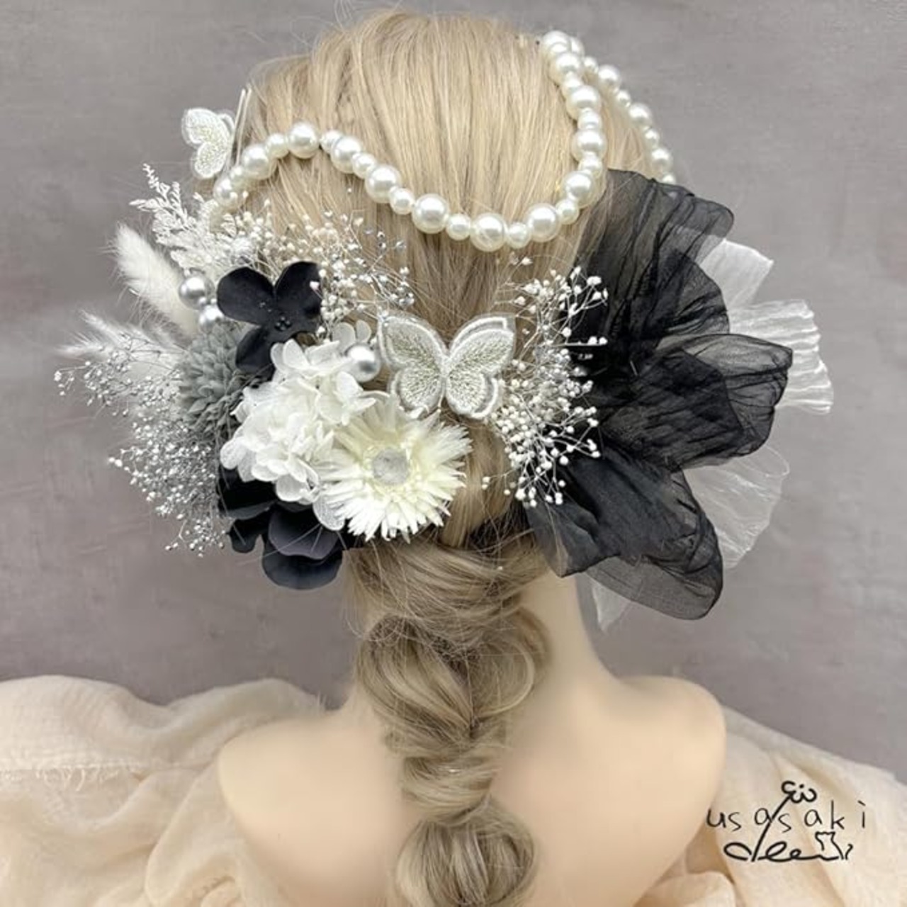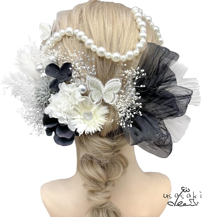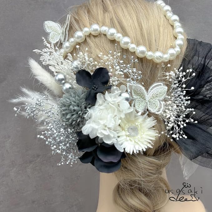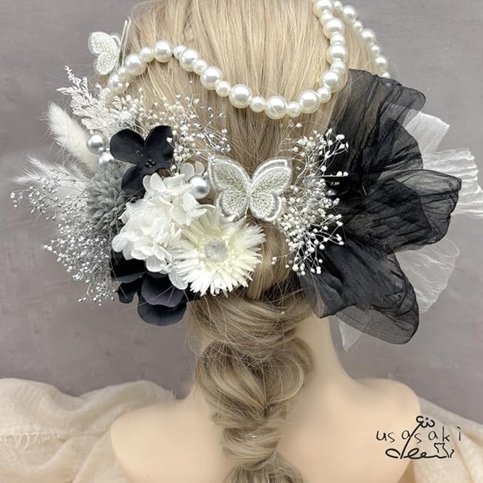 [Usasaki] 髪飾り 成人式 前撮り マム アジサイ 卒業式 入学式 カスミ草 ドライフラワー振袖 袴 ウェディング 結婚式 和装 赤 白 黒 ベリーピック パールチェーン 蝶々 ヘアアレンジ ハーフアップ ロングヘア A24110006