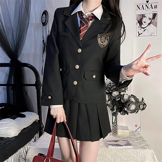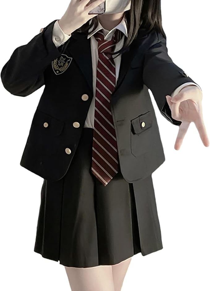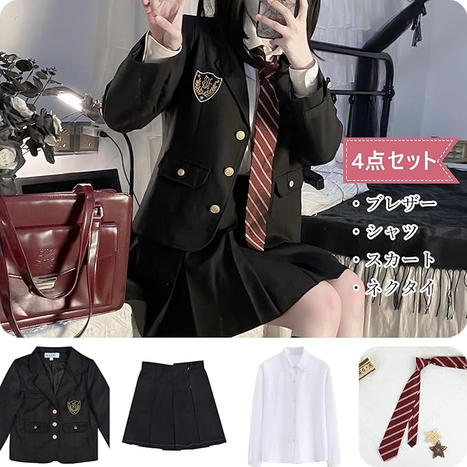 [QOOLYㅤ] 女子高生 制服 コスプレ 黒 ブレザー プリーツスカート ネクタイ 長袖シャツ 4点セット 女子高校生 JK 本格制服 学生服 コスチューム 仮装 スクールスーツ 学園祭 文化祭 卒業式 入学式