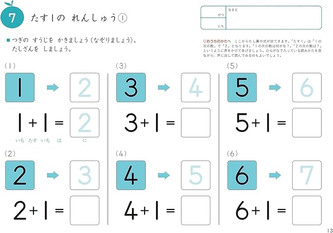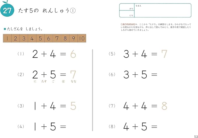 30までの数字の読み書きを復習し、「たす5」までのたし算を練習します。50までの数字がうまく読み書きできるようになってきたお子さまに。