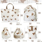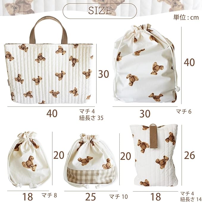 サイズ:レッスンバッグ縦30 横40 マチ4㎝、シューズバッグ縦26 横18 マチ4㎝、巾着大縦40 横30 マチ6㎝、巾着小縦20 横18 マチ8㎝、弁当袋縦20 横25 マチ10㎝