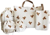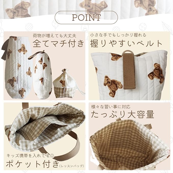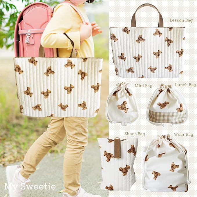 仕様:キルティング生地・リバーシブル(レッスンバッグとシューズケースの2点)、5点全てマチと裏地付き