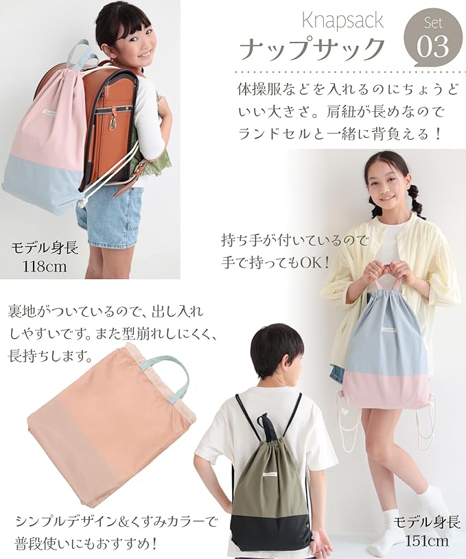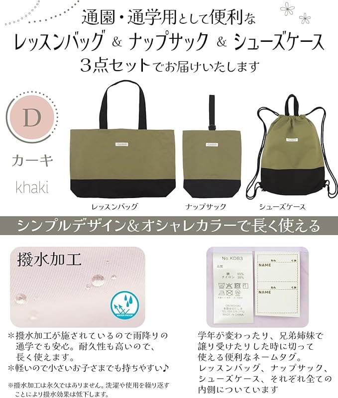 【3点セット】通園・通学用として便利な《レッスンバッグ&ナップサック&シューズケース》の3点セットでお届けいたします。シンプルデザイン&おしゃれカラーで長く使えます。軽いのでお子様でも持ちやすいです。薄手なので使用しないときは畳んでコンパクトに。ランドセルの隙間にも入っちゃいます。 【撥水加工】撥水加工が施されているので雨降りの通学でも安心。※撥水加工は永久ではありません。洗濯や使用を繰り返すことにより撥水加工は低下します。【撥水加工】撥水加工が施されているので雨降りの通学でも安心。※撥水加工は永久ではありません。洗濯や使用を繰り返すことにより撥水加工は低下します。