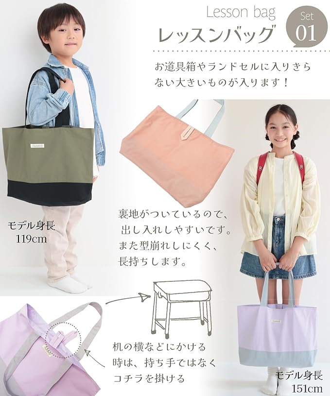 【レッスンバッグ】お道具箱やランドセルに入りきらない大きいものが入ります!机の横にかける時は内側のフックをお使いください。底が床につかず安心です。(サイズ:縦30 横46 マチ8 cm)