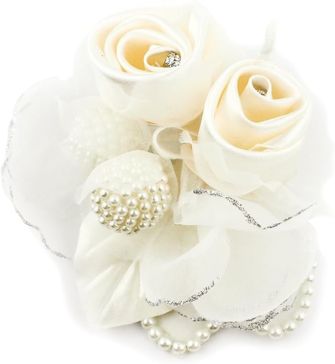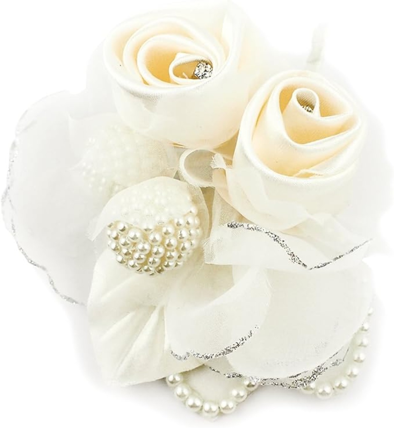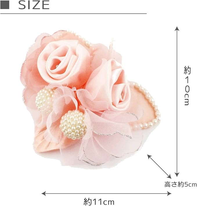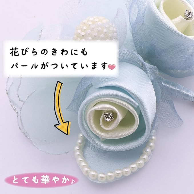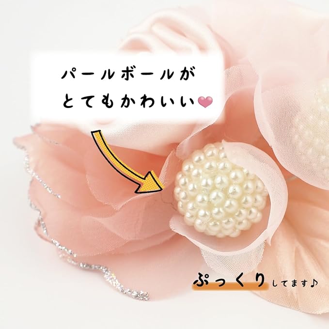■パールボールが可愛らしさを演出:2個のパールボールが特徴的な可愛らしいコサージュです。さらに花びらの縁にパールやシルバーラメを演出し、ゴージャスに仕上がりました。