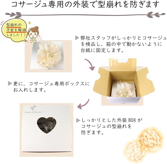 ※コサージュ専用の外装箱に入れて発送しますので、つぶれる心配はありません。