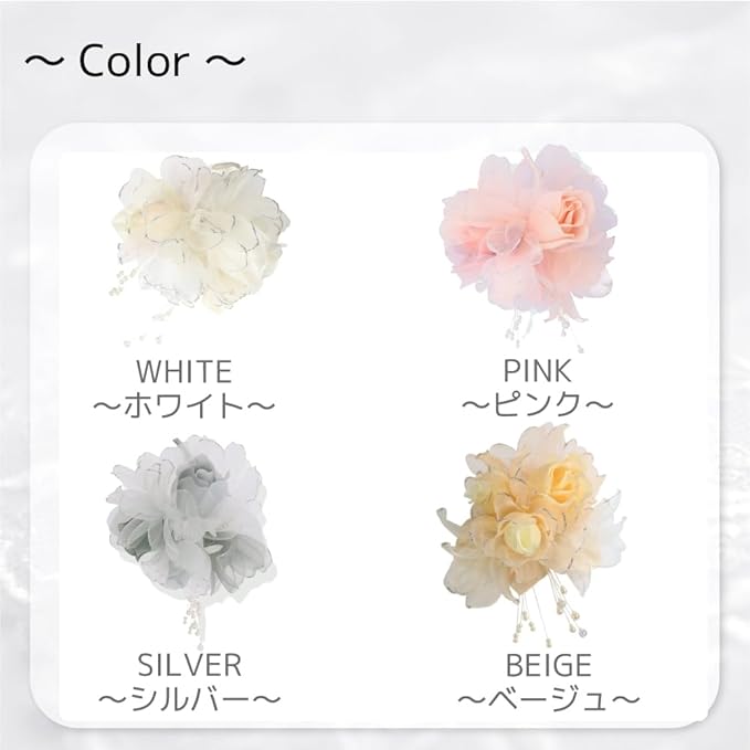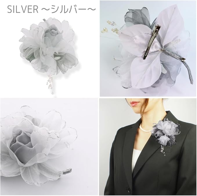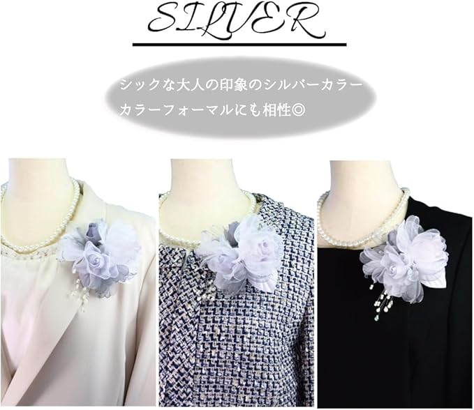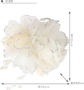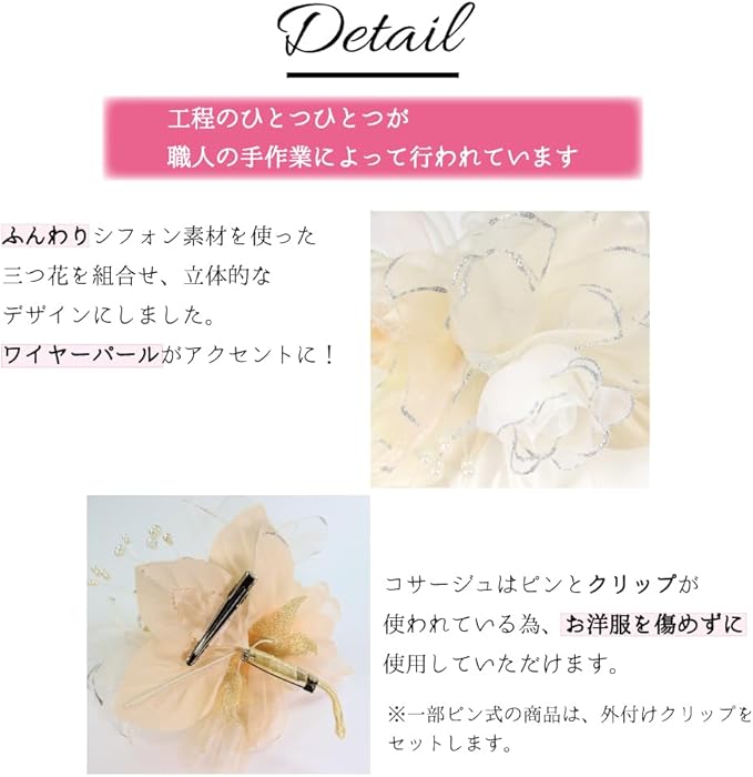 ■ふんわりエレガントなシフォン生地:ラメをあしらったシフォン生地を大小つぼみの周りにあしらったボリューミーなコサージュです。2種類のワイヤーパールがアクセントになっています。