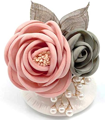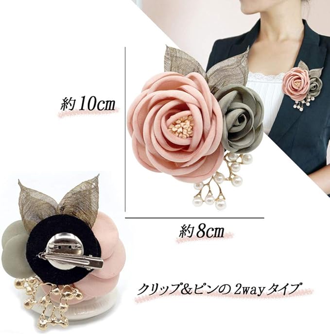 葉っぱとパールで包まれ、落ち着いた色の2つの大小のローズのお花がどんな色の洋服にもしっくりきます。また、この2つのお花の色が違うことでどんなお洋服の色にもあわせやすくなっています