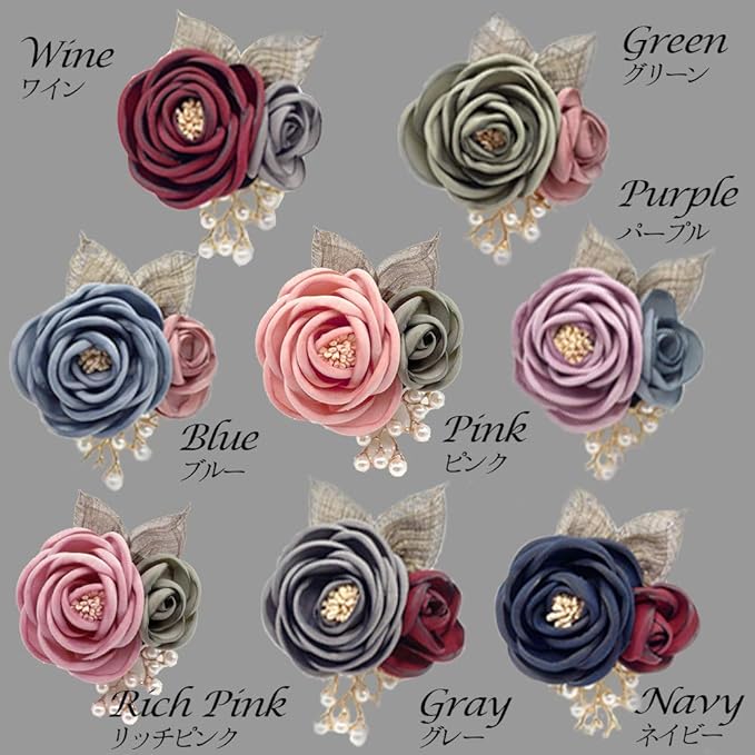 トレンドのくすみカラーで上品な印象でお洒落です。 ピンクのスーツ、紺のスーツ、グレーのスーツに似合うコサージュを探せるように背景を変えているのでごらんくださいませ