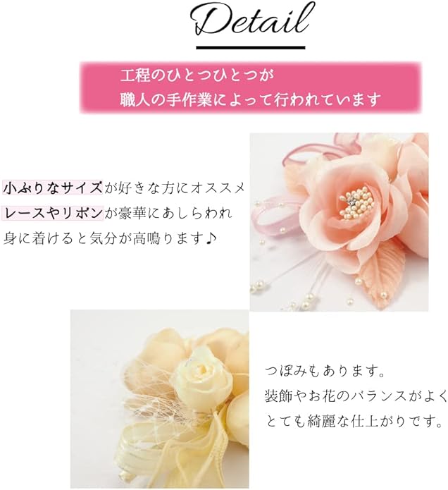 ■3つ花と2つのつぼみでエレガントに:3つの花(ローズ)に2つのつぼみをデザインし、レース、リボン、ワイヤーパールと様々なパーツを組み合わせたとても豪華でエレガントな仕上がりとなりました。