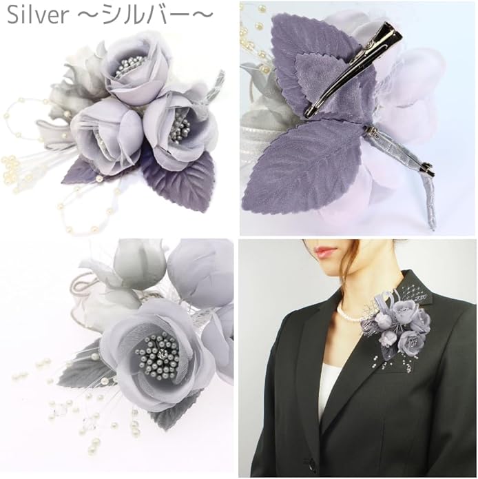 [クレインズコレクション] 手作り 三つ花ローズ コサージュ ブローチ ピン フォーマル シーンや エレガント な装いに シルバー