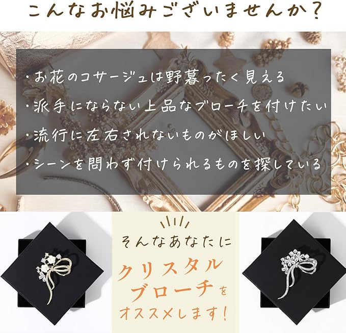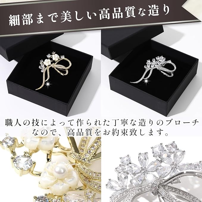 【細部にまでこだわった造り】職人の技によって作られた丁寧な造りの高品質なブローチ。まるでダイヤモンドのようなキラキラとした輝きを放ち、高級感もありシンプルかつ飽きの来ないデザイン。セレモニーやパーティー、派手すぎない清楚で落ち着いた上品な大人可愛いデザイン。