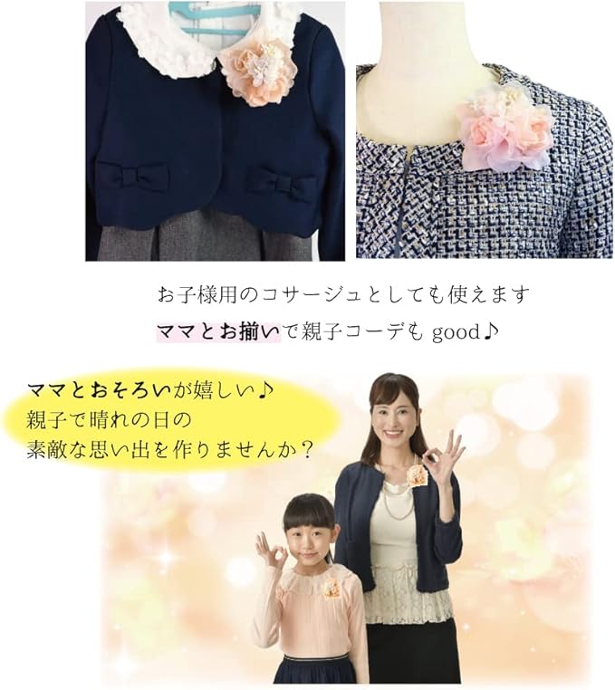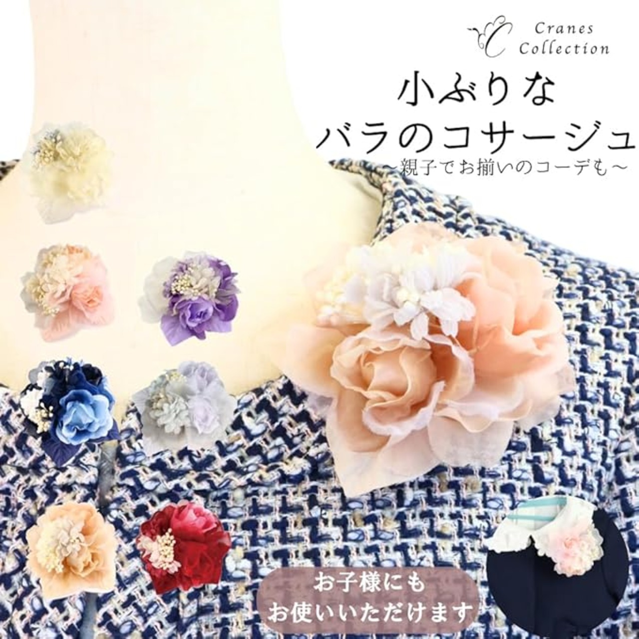 小さめのバラのつぼみが2輪と色の異なる小花を組み合わせた可愛らしいコサージュブローチです。小ぶりなので、大人はもちろんお子様にもお使いいただけます。親子お揃いのコサージュをつけて、親子コーデはいかがでしょうか。 入学 入園式 や 卒業 卒園式だけでなく、 結婚式 ・ 2次会 ・ イベント ・ パーティ や普段の カジュアル 使いにも ※コサージュ専用の外装箱に入れて発送しますので、つぶれる心配はありません。