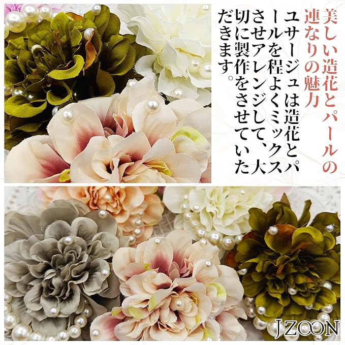 「上品で洗練されたデザイン」 造花とパールでお手作りしたコサージュです。シックなデザインのコサージュは、エレガントで美しく、気品と優雅な印象を与ます。飾されたパールの連なりは、まるで朝の花に露滴のようで、高級感を醸し出しています