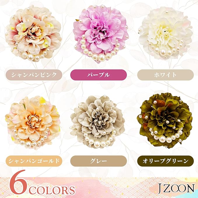 「6色展開」 人気の6色からお好みのお色をお選びいただけます。パールとダリアの形をしたエレガントで愛らしいこのコサージュは、制服や和装スタイルに、大人から子供までお使いいただけます。