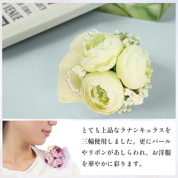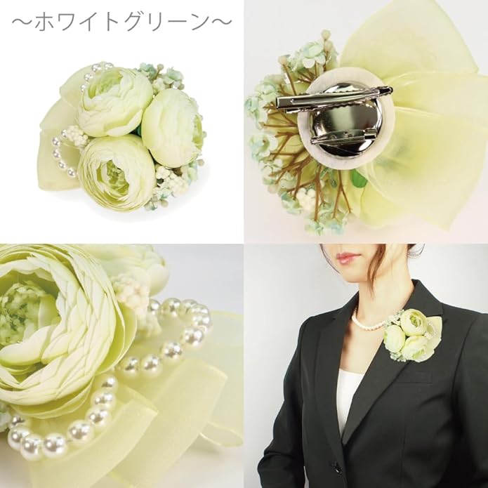 [クレインズコレクション] 日本製 三つ花ラナンキュラス コサージュ ブローチ クリップ 2WAY フォーマル 入学式 卒業式 入園式 卒園式 結婚式 発表会 演奏会 パール & リボン 自社生産 (ホワイトグリーン)
