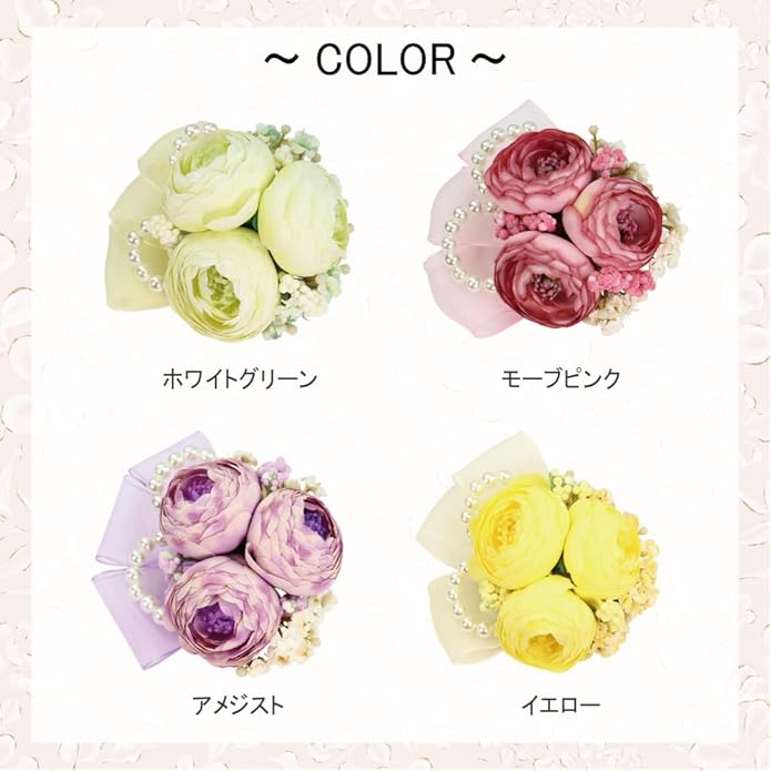 ■かわいい三つ花のラナンキュラス:グラデーションのラナンキュラスをメインに小花とヘップをあしらったコサージュです。ワイヤーパールとオーガンジーリボンをアクセントに可愛らしく仕上がったコサージュです。あえてラメ装飾をせず、落ち着いたナチュラルなお色味が胸元を華やかに彩ります。