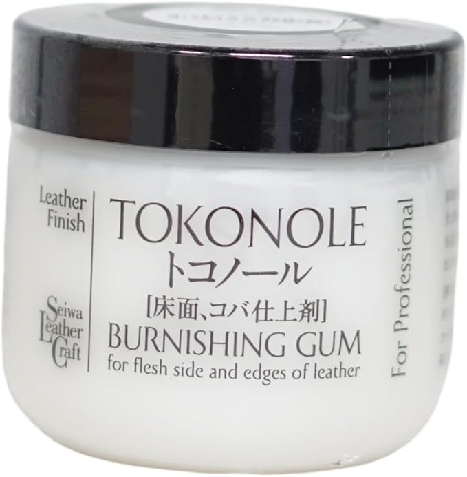 コバ(革の切り端)をなめらかに: 1. トコノールを指先に少量とり、コバに薄く塗布します。コバからはみ出たトコノールは早めに拭き取ります。残したままだとシミの原因になります。 2. トコノールが半乾きになったらプレススリッカー等で磨き、毛羽立ちをおさえます。やわらかい布で磨いても。 使用上の注意 使用後はフタをしっかり閉めること。 塗ってすぐ磨いても、少し時間を置いてから、再度磨くと抜群の艶が出るのでご安心下さい。