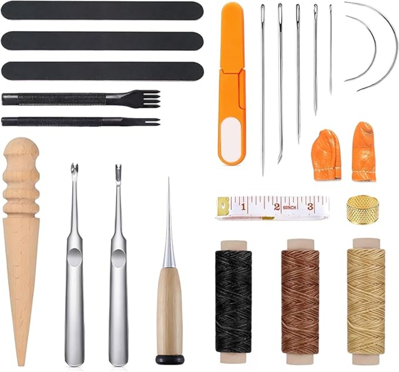 セット内容:計24点セット。千枚通し*1、系*3、指カバー*2、裁縫用針*7、ハサミ*1、指貫*1、測定尺*1、溝堀り革工具*2、レザーエッジ研削研磨ツール*3、菱目打ち*2、コバ磨き*1。