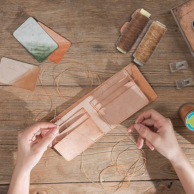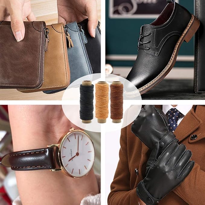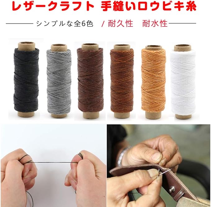 蝋引き糸色:6色選択可能。レザークラフトに最適の蝋引き糸!ロウ引き済だからすぐに縫い始められ、細かいステッチにも耐える強度があります。ロウ引きされた紐はとても丈夫で、水にも強いです。丈夫で切れにくく、スムーズな縫い心地
