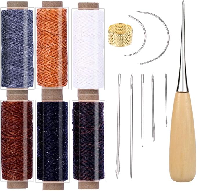 RMTIME 蝋引き糸 レザークラフト 15点セット 革 DIY 手作り 裁縫 ロウ引き糸 直径0.8mm 長さ50m 6色 縫い糸用針 指守り輪 レザーツール 皮革 工具 手芸