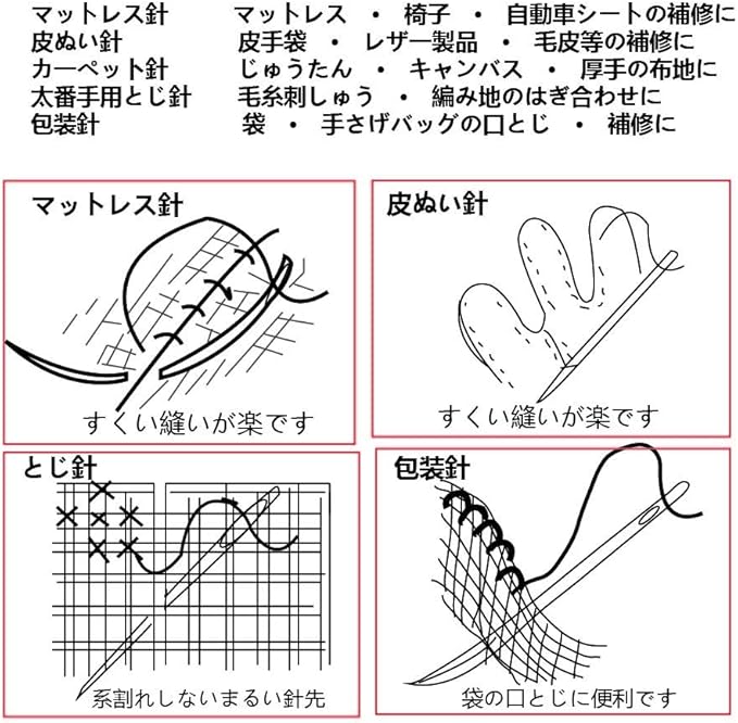 高品質針セット:手縫い針は硬く耐久性のある金属製の鉄でできて、曲がりにくい、なめらかで、耐食性と耐摩耗性が抜群です。サイズと形状がそれぞれ違う針はご用途と目的によりご自由に選ぶことができる