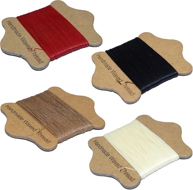 【4色セットで多様な作品に対応】(赤・黒・ダークブラウン・オフホワイト)、(白・黄・青・緑)各巻約20m(太さ0.65mm)の蝋引き糸セット。革製品や手芸作品の色合わせが簡単で、多彩なデザインを楽しめます。