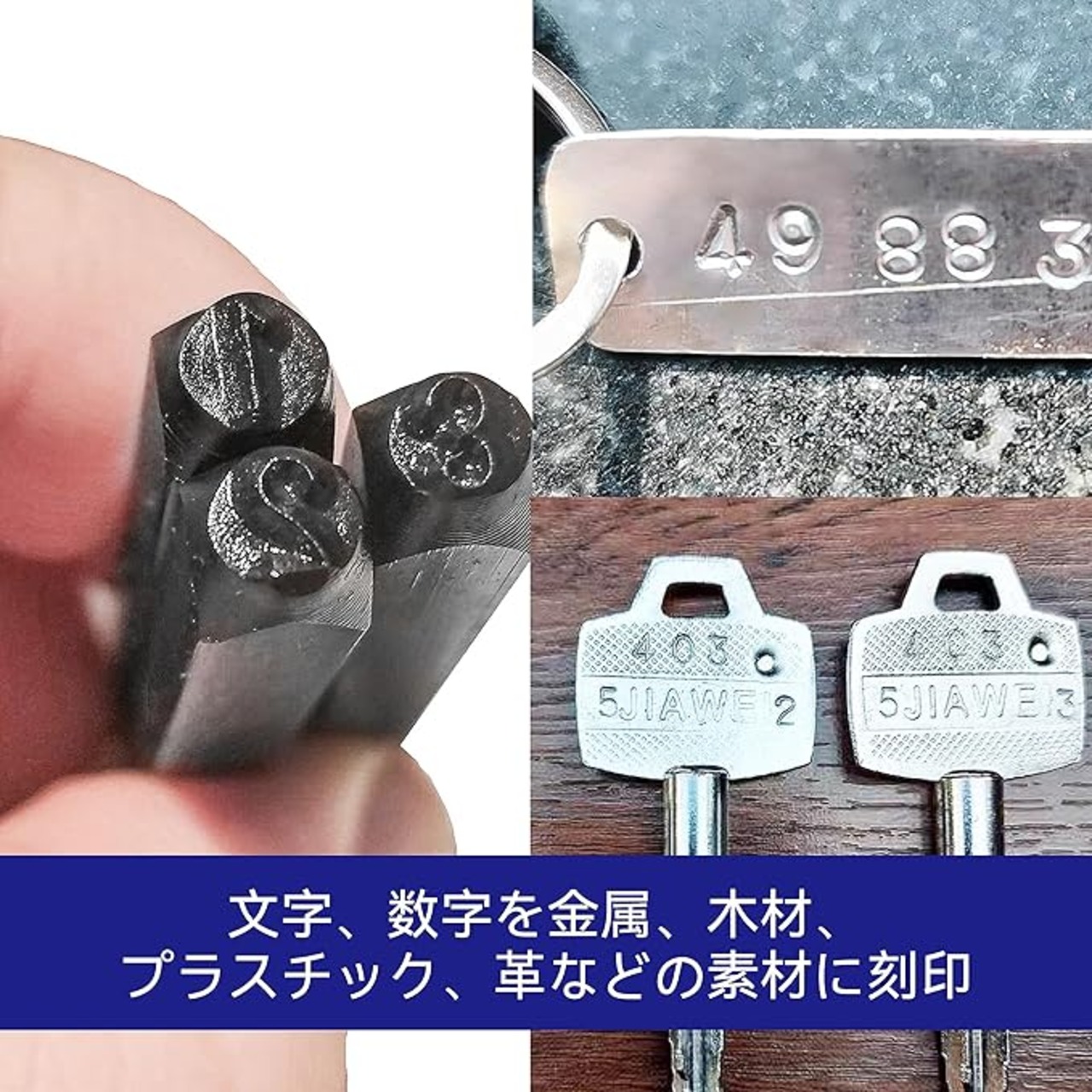 文字、数字を金属、木材、プラスチック、革などの素材に刻印。