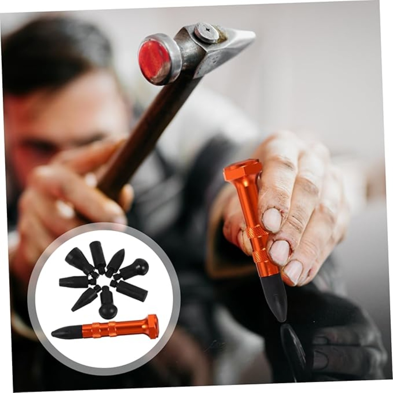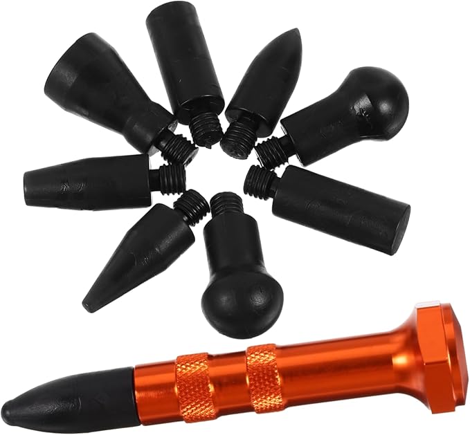 【交換ヘッド9種】先端チップは形状とサイズが異なる9種を同梱し、へこみの大きさや位置に合わせて使い分けできます。硬さや先端形状を変えることで当たりを調整しやすく、ドアパネル ボンネット ルーフなど多部位で活躍します。