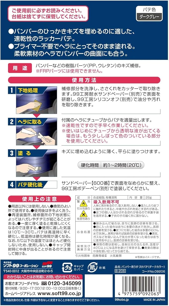ソフト99(SOFT99) 99工房 補修用品 バンパー用うすづけパテ ダークカラー用 バンパーなどの樹脂パーツ(PP、ウレタン)のキズ補修 09206