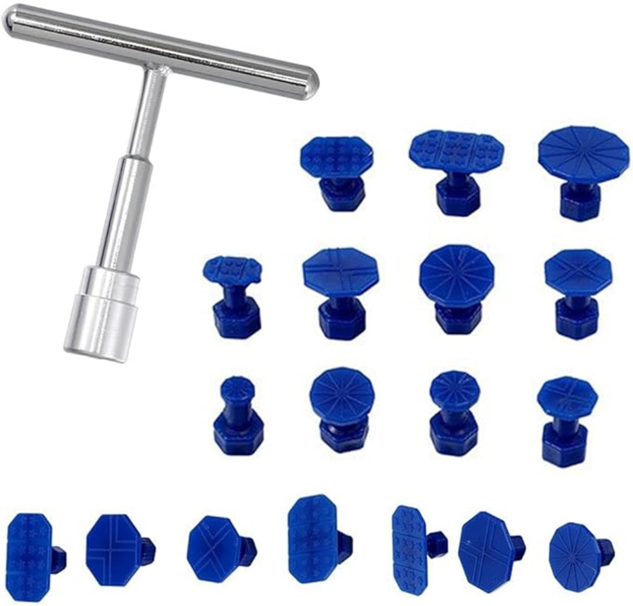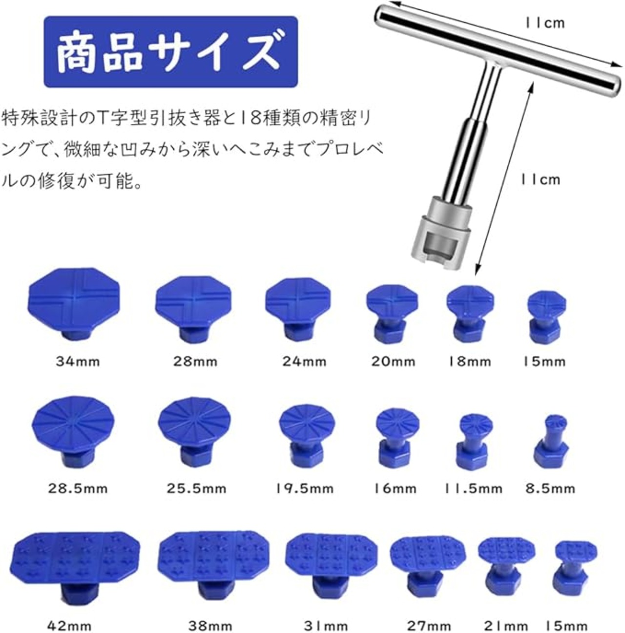 【プロ仕様の修理精度】特殊設計のT字型引抜き器と18種類の精密リングで、微細な凹みから深いへこみまでプロレベルの修復が可能。車体の曲面にもフィットする設計で、仕上がりが美しい。