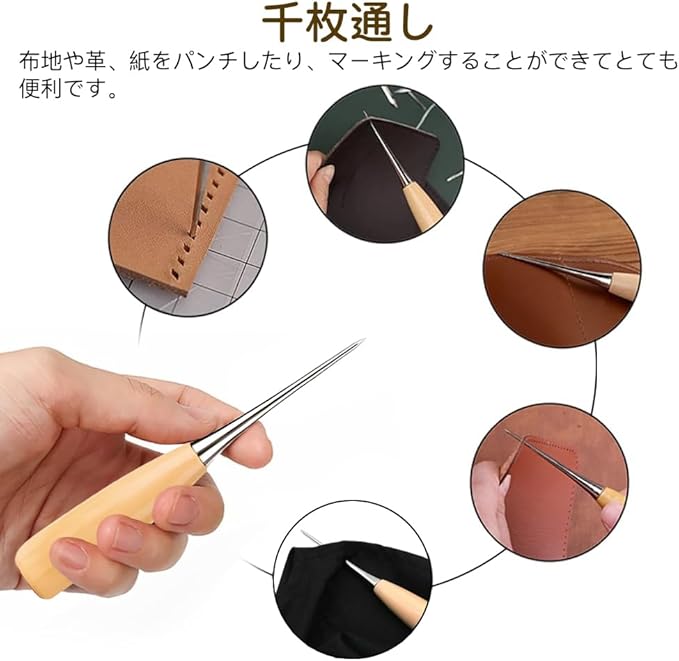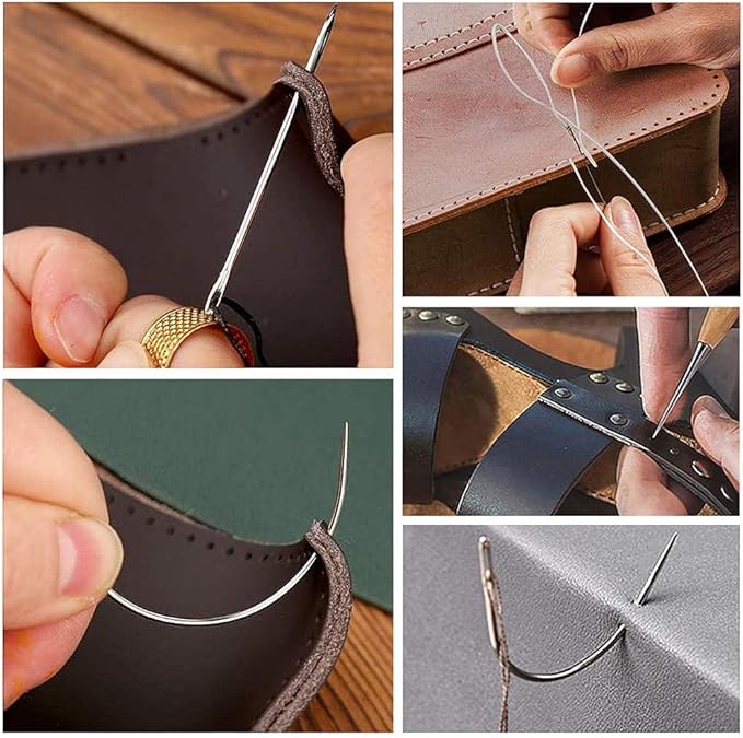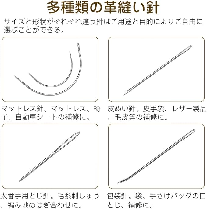 多種類の革縫い針:針先が丈夫で鋭いです。革用の工具セットに様々なサイズと形をしている針先があります。結び目の針と先鋭い針、三角針、カーブ針なども含まれます。