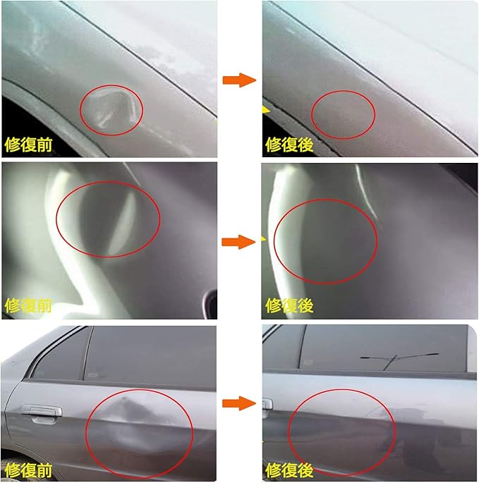 注意事項:①大き過ぎる凹み、小さすぎる凹み、鋭角についている凹み、プレスラインにかかっている凹み等に関しては修復不可な場合がございます.②これはDIYの簡単作業で100%完全な修復を保証されないです。作業方法と個人的原因によって、修復効果も違います.